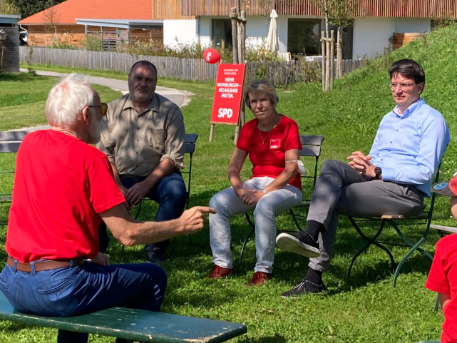 Die Sonne strahlte nur so vom Himmel und lud ein, einen Spaziergang durch das Wohngebiet Klosteranger zu machen. Florian von Brunn, Landesvorsitzender der Bayern SPD ließ sich alles genau erklären und stellte sich anschließend gemeinsam mit dem 2. Bürgermeister der Gemeinde Weyarn, Dr. Franz Demmelmeier (SPD), sowie Fraktionssprecherin Betty Mehrer (SPD) und Mathias Fackler, (SPD) Jugendbeauftragter der Gemeinde Weyarn den Fragen der Gäste. Das Thema Wohnen auf dem Land - bei rapid steigenden Bodenpreisen und damit auch Mietpreisen hatte es in sich. Hier sind eine vorausschauende Politik der Kommunen sowie staatliche Regelwerke gefragt.