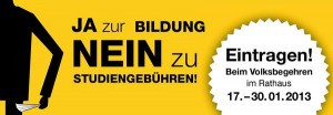 Vom 17.01.2013 bis 30.01.2013 sind alle wahlberechtigten Bürger aufgerufen, sich für das Volksbegehren einzutragen und sich an der direkten Demokratie zu beteiligen. Eintragungslisten liegen in dieser Zeit in den Rathäusern und weiteren Eintragungsorten aus.