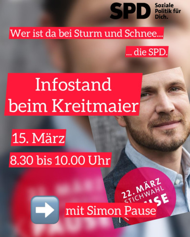 Nach dem super Ergebnis von Simon Pause bei der Kommunalwahl am 8.3.26 gehts nun in den Endspurt und zur Stichwahl am 22.3.26. Um einen fortschrittlichen, klugen und kompetenten Bürgermeister zu bekommen, legen wir alle nochmal richtig los. Am 22.3. Simon Pause wählen!!