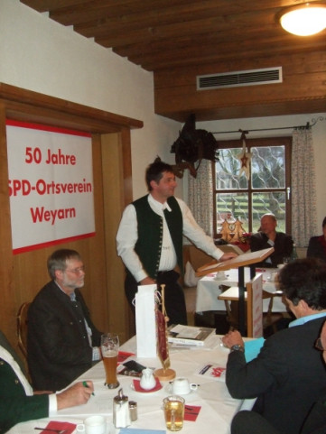 Richard Hillmeier, Ortsvereinsvorsitzender der Valleyer SPD, sprach von der Verbundenheit der Valleyer mit den Weyarnern. Immerhin ist der Weyarner Ortsverein der Patenverein der Valleyer. Schon seit einigen Jahren werden viele Veranstaltungen wie Wanderungen, Radltouren und der traditionelle Herbstausflug gemeinsam durchgeführt.\r\n\r\nAuch Bundestagsabgeordneter Klaus Barthel, der Stimmkreisabgeordnete der SPD, kam, um den Weyarnern zur gratulieren.
