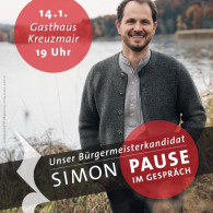 Die Vorstellungstour unseres Bürgermeisterkandidaten Simon Pause geht weiter. Am kommenden Mittwoch, 14.1., 19.00 Uhr im Gasthaus Kreuzmair in Holzolling; am Donnerstag, 15.1. um 14.30 Uhr im Bürgergewölbe in Weyarn; am Donnerstag, 22.1., 19.00 Uhr Podiumsdiskussion im Landgasthof Neukirchen. Weitere Termine folgen.